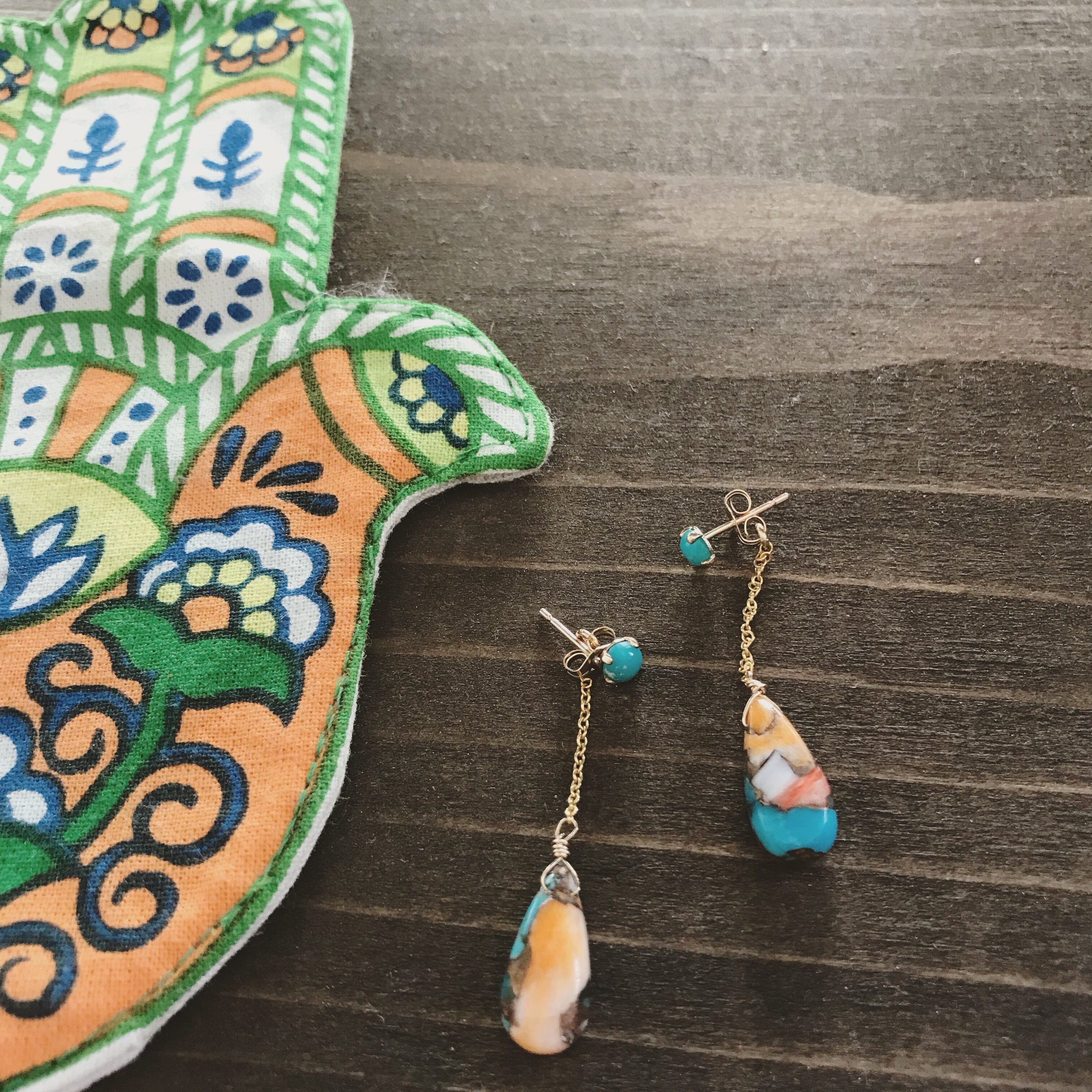 14kgf アリゾナ スタビライズドターコイズのポストピアスにサンセットを思わせるグラデーションで人気のオイスターコッパーターコイズをぶら下げたピアスです